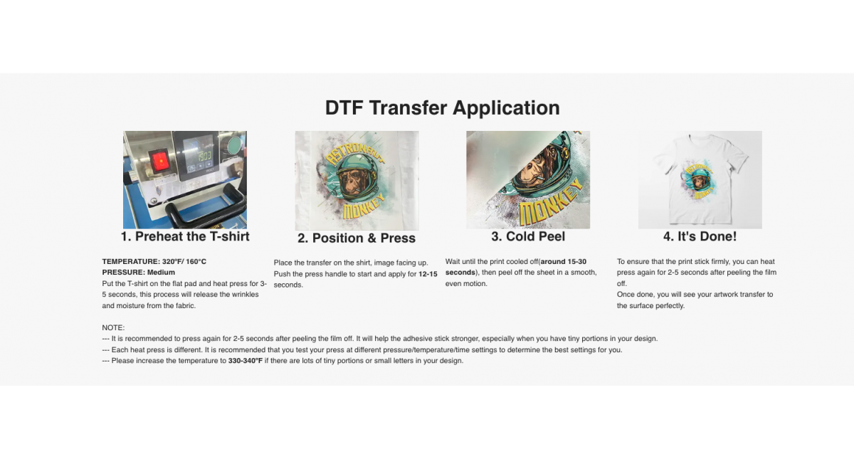 Please be aware that elements of your design that are smaller than 1/4 of an inch are at risk of not transferring to the garment successfully.