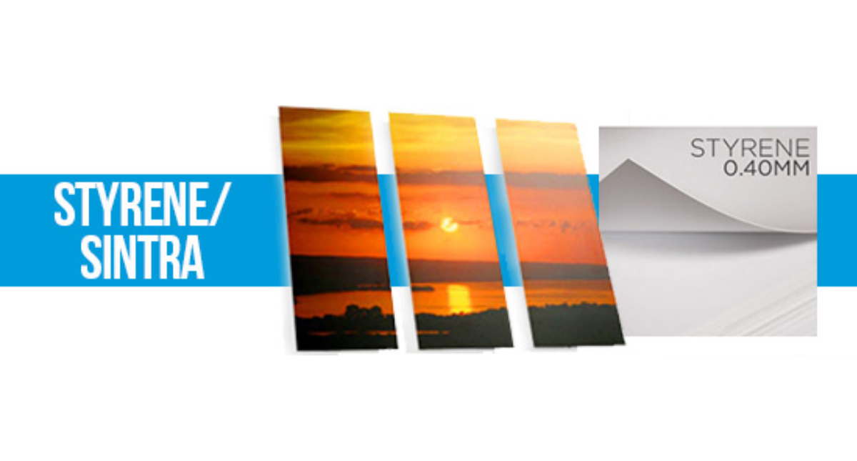 /Directly printed on Styrene/Sintra (.040mm). It is a lightweight material (PVC) that may be used for exhibits, displays, photo-mounting etc. It is an economical signage product that can be used for indoor and outdoor applications.